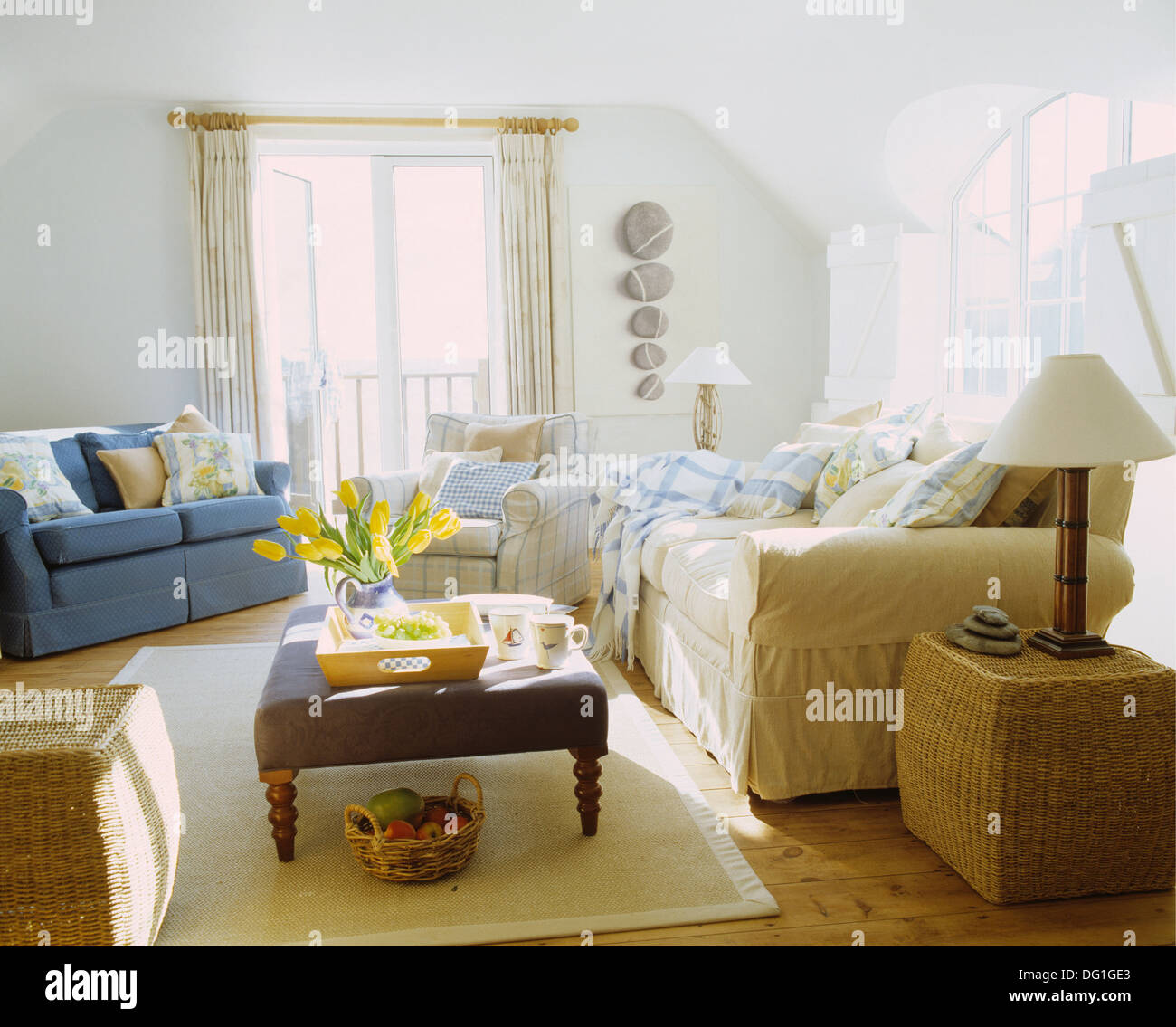 Cube En Osier Et De Tables Canapes Bleu Et Creme En Blanc